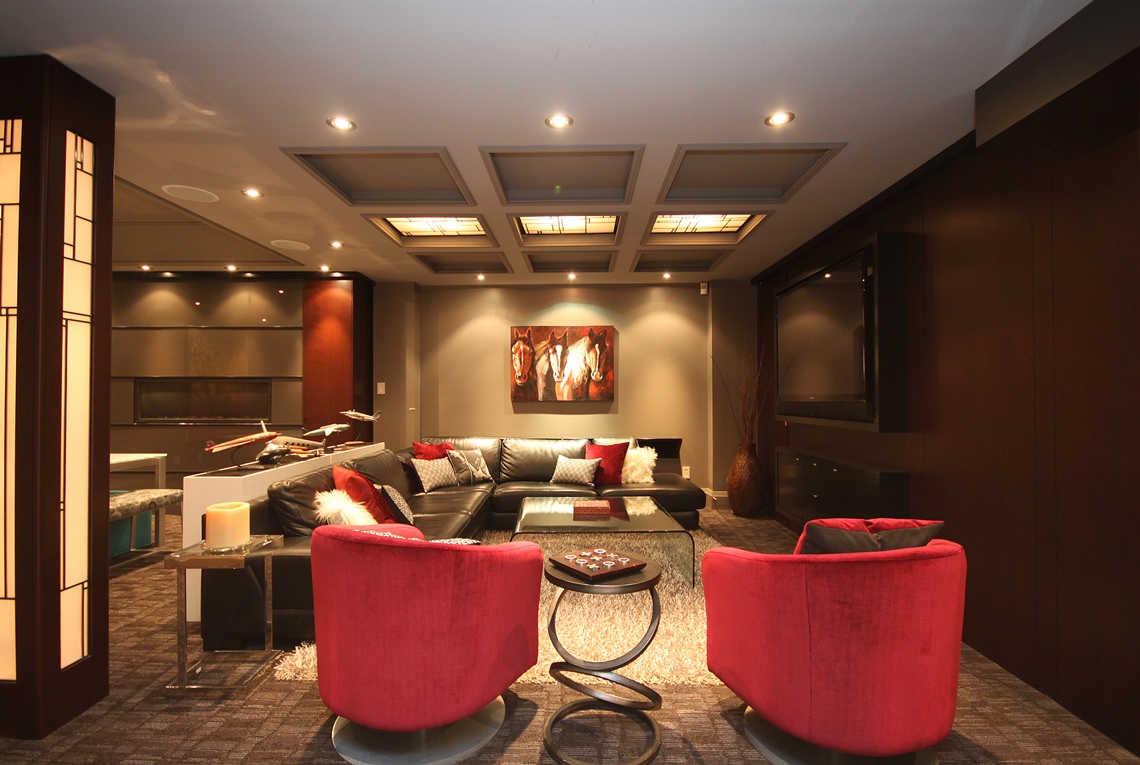 The lower level of a full-scale renovation in a client's home. This modern interior creates an area perfect for cacooning and family time. The renovation involved transforming the basement of the clients' home into a complete entertainment area that includes two bedrooms, a games room, an exercise room, a family spa, a theatre room with 7.1 sound equipment, and a music studio with built-in audio/visual recording equipment.
